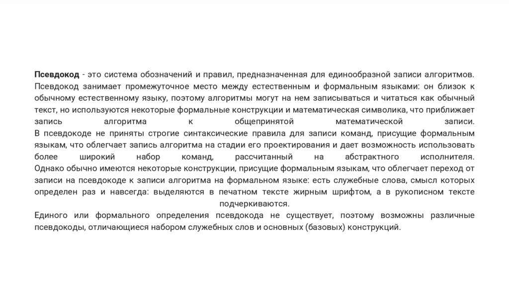 описания алгоритмов (блок-схемам, псевдокодам). Однако