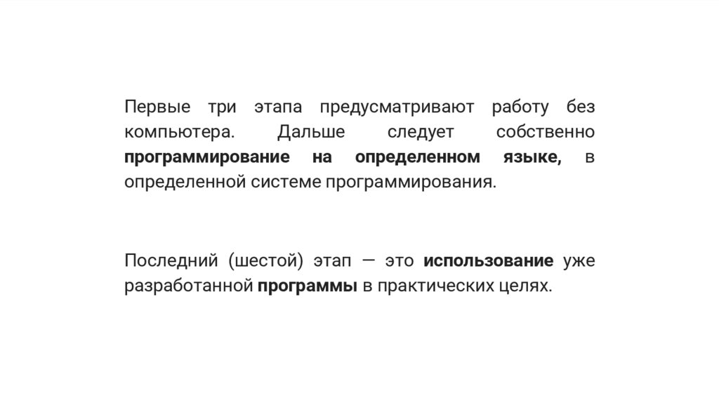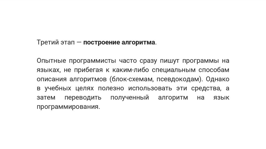 Третий этап — построение алгоритма.Опытные программисты часто сразу пишут программы на