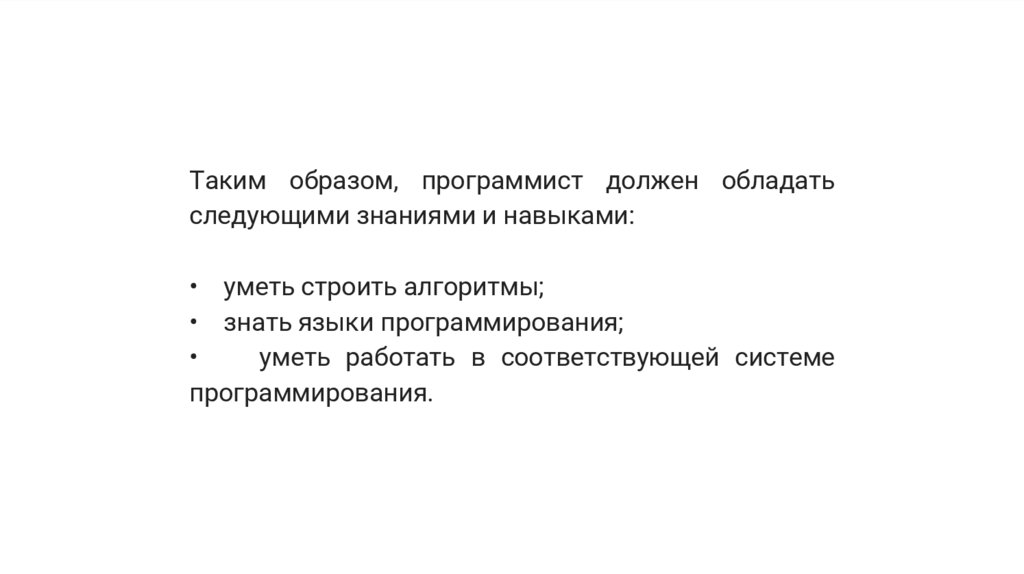 Таким образом, программист должен обладатьследующими знаниями и навыками: