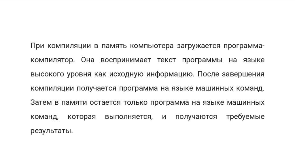 При компиляции в память компьютера загружается программакомпилятор. Она воспринимает текст программы на языкевысокого уровня как исходную информацию. После завершения