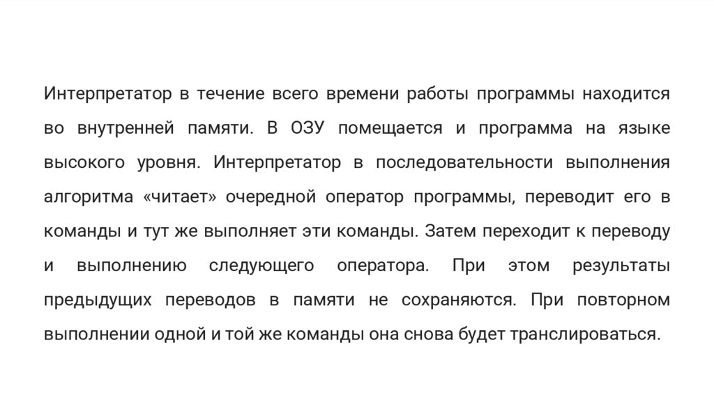 Интерпретатор в течение всего времени работы программы находитсяво внутренней памяти. В ОЗУ помещается и программа на языке