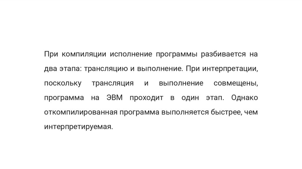 При компиляции исполнение программы разбивается надва этапа: трансляцию и выполнение. При интерпретации,