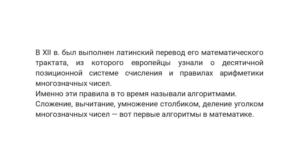 В XII в. был выполнен латинский перевод его математическоготрактата, из которого европейцы узнали о десятичной