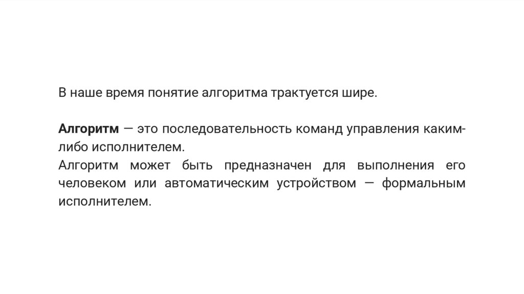 В наше время понятие алгоритма трактуется шире.Алгоритм — это последовательность команд управления какимлибо исполнителем.