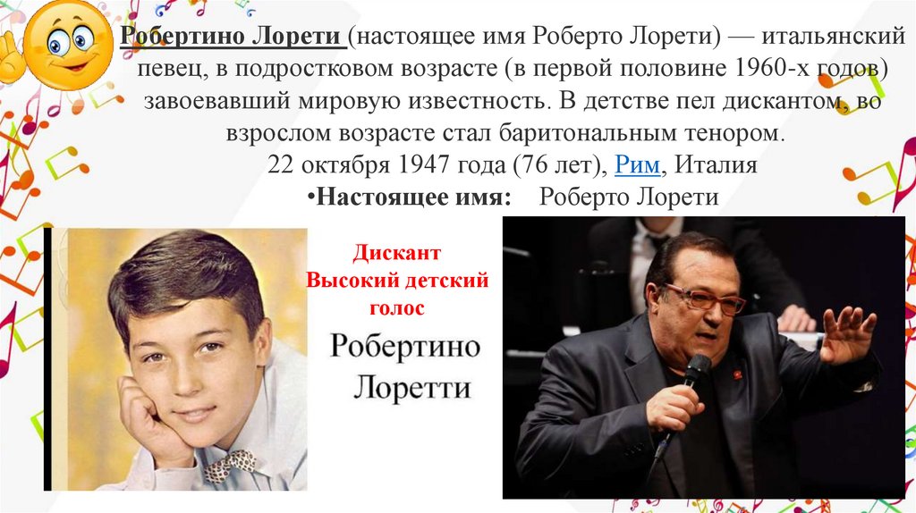 Робертино Лорети (настоящее имя Роберто Лорети) — итальянскийпевец, в подростковом возрасте (в первой половине 1960-х годов)