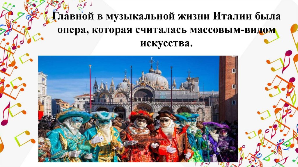 Главной в музыкальной жизни Италии былаопера, которая считалась массовым-видом