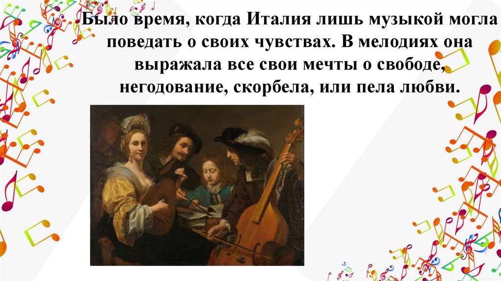 Было время, когда Италия лишь музыкой моглаповедать о своих чувствах. В мелодиях она
