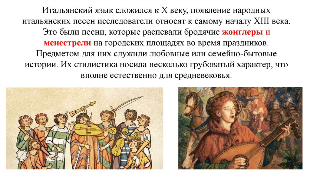 Итальянский язык сложился к X веку, появление народныхитальянских песен исследователи относят к самому началу XIII века.