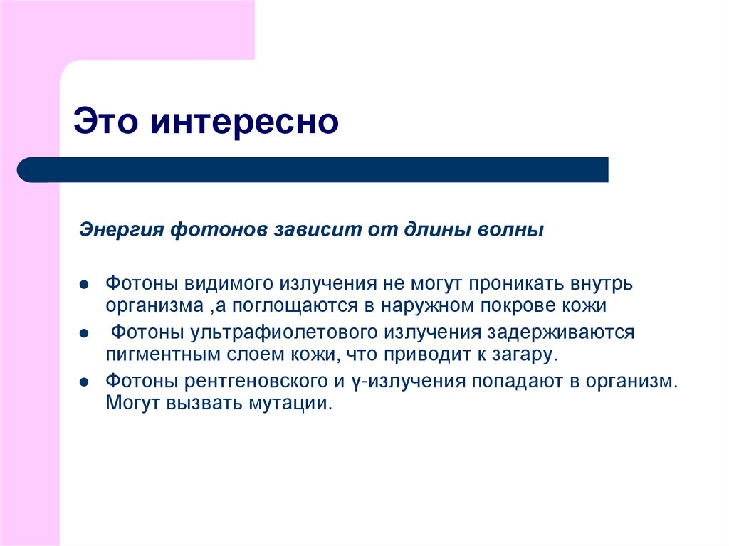 Энергия фотонов зависит от длины волныФотоны видимого излучения не могут проникать внутрь