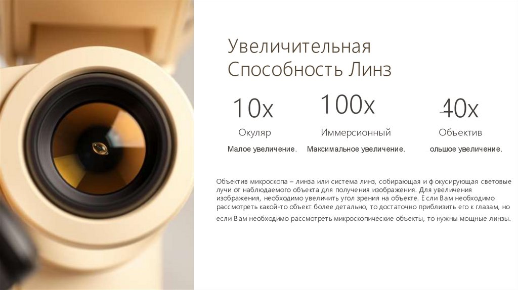 Объектив микроскопа – линза или система линз, собирающая и ф окусирующая световые
