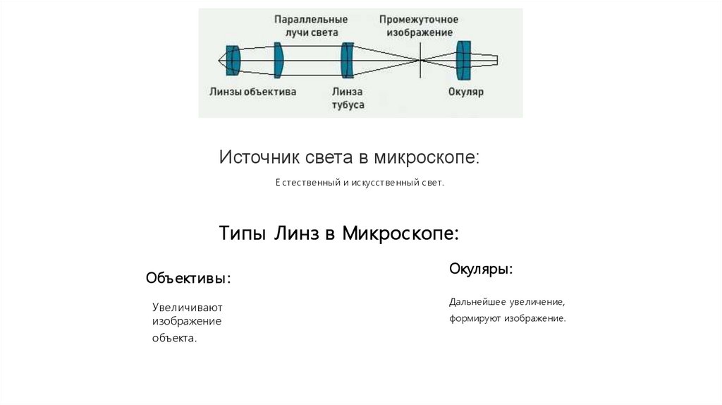 Источник света в микроскопе:Е стественный и искусственный свет.