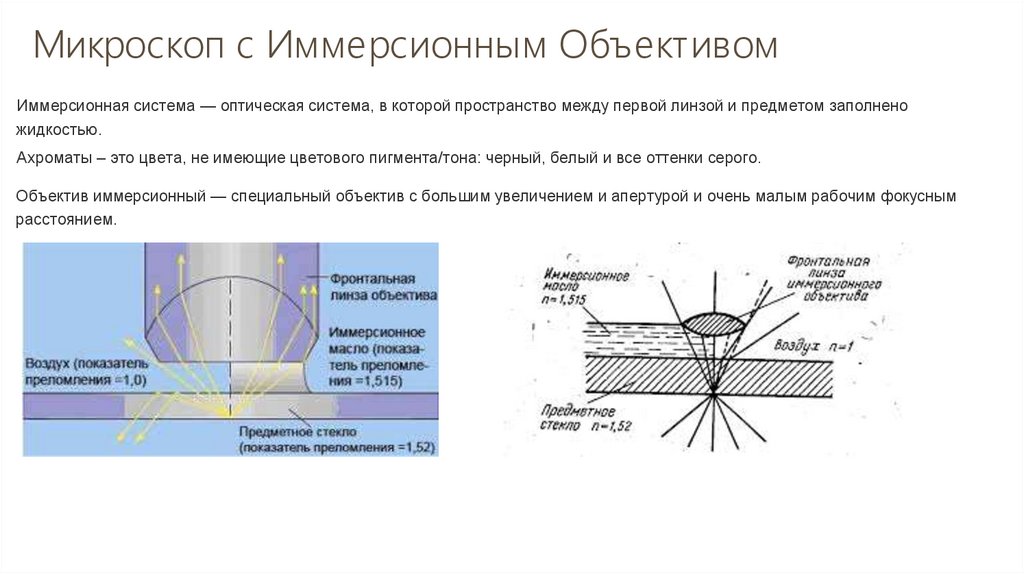 Микроскоп с Иммерсионным ОбъективомИммерсионная система — оптическая система, в которой пространство между первой линзой и предметом заполнено
