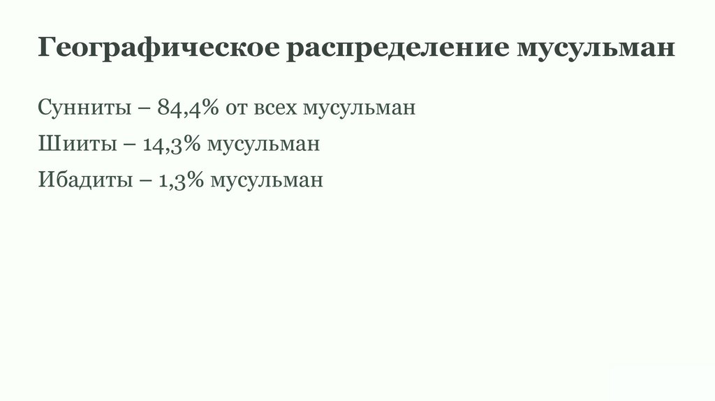 Географическое распределение мусульманСунниты – 84,4% от всех мусульман