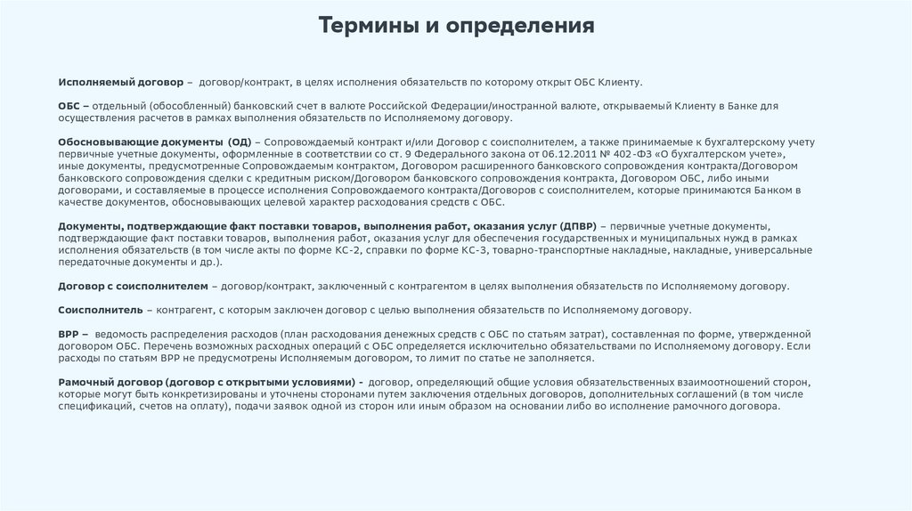 Термины и определенияИсполняемый договор – договор/контракт, в целях исполнения обязательств по которому открыт ОБС Клиенту.
