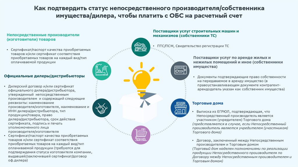 Как подтвердить статус непосредственного производителя/собственникаимущества/дилера, чтобы платить с ОБС на расчетный счет