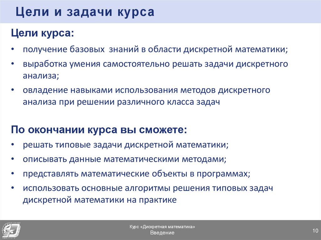 • получение базовых знаний в области дискретной математики;