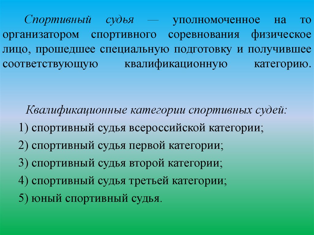 2. Спортивный судья — уполномоченное на то организатором спортивного соревнования физическое лицо, прошедшее специальную