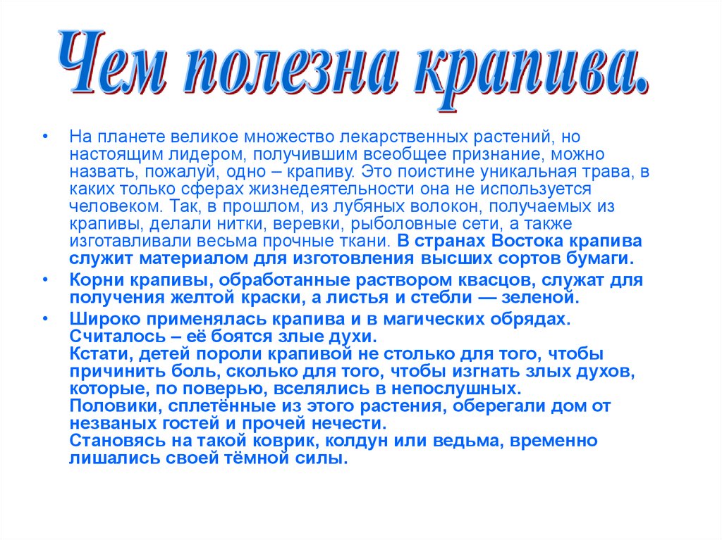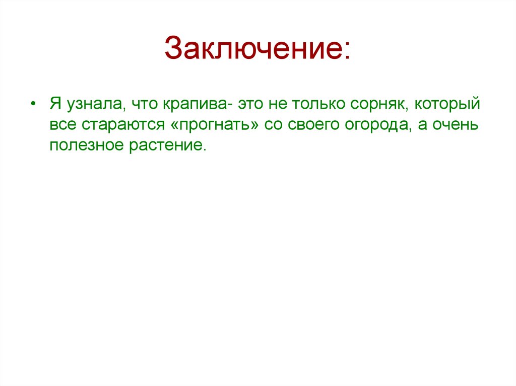 • Я узнала, что крапива- это не только сорняк, которыйвсе стараются «прогнать» со своего огорода, а очень