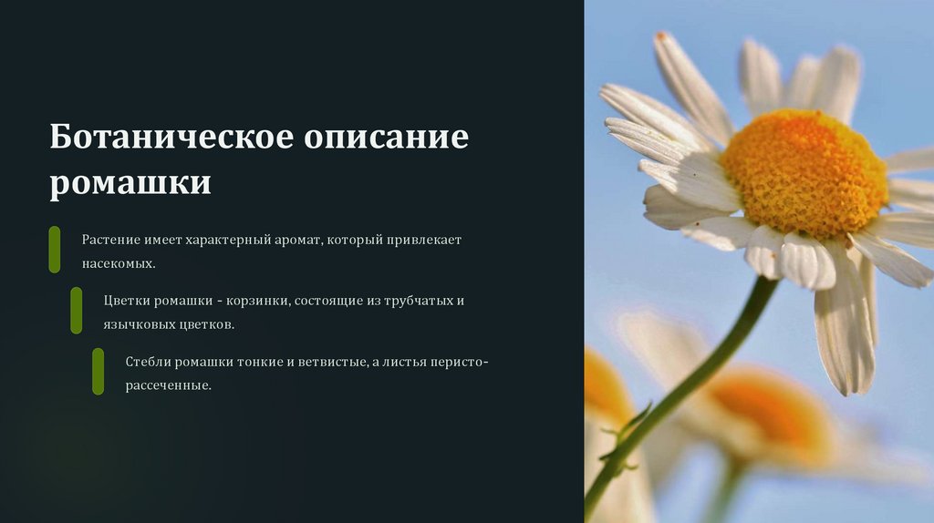 Стебли ромашки тонкие и ветвистые, а листья перисторассеченные.