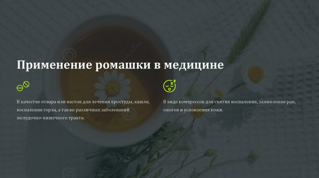 Применение ромашки в медицинеВ качестве отвара или настоя для лечения простуды, кашля,