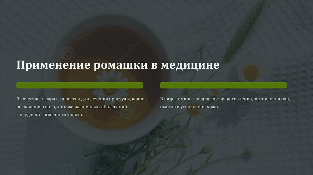 Применение ромашки в медицинеВ качестве отвара или настоя для лечения простуды, кашля,
