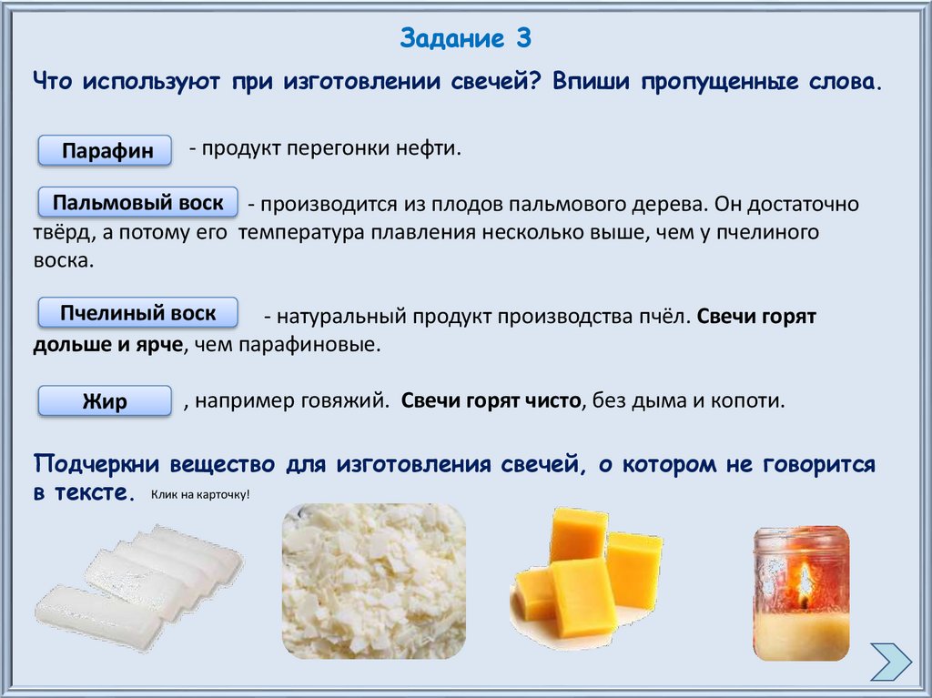 Задание 3Что используют при изготовлении свечей? Впиши пропущенные слова.