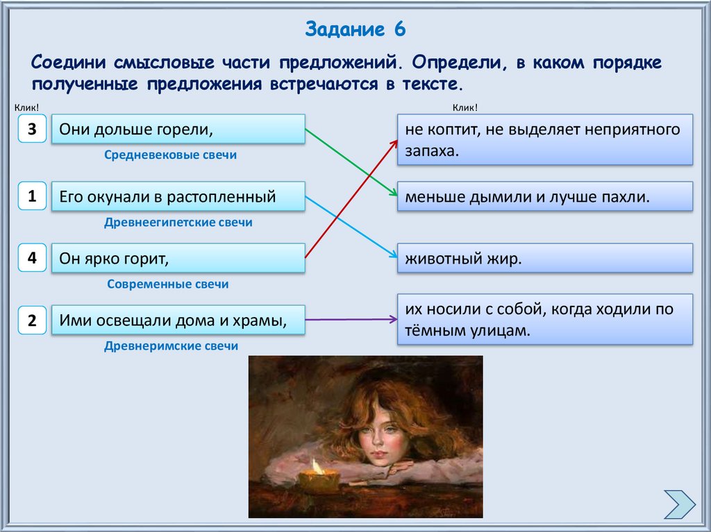Задание 6Соедини смысловые части предложений. Определи, в каком порядке