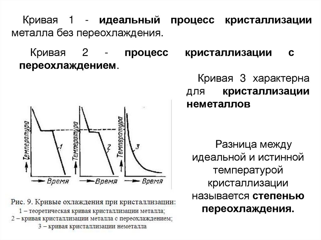 Кривая 1 - идеальный процесс кристаллизацииметалла без переохлаждения.