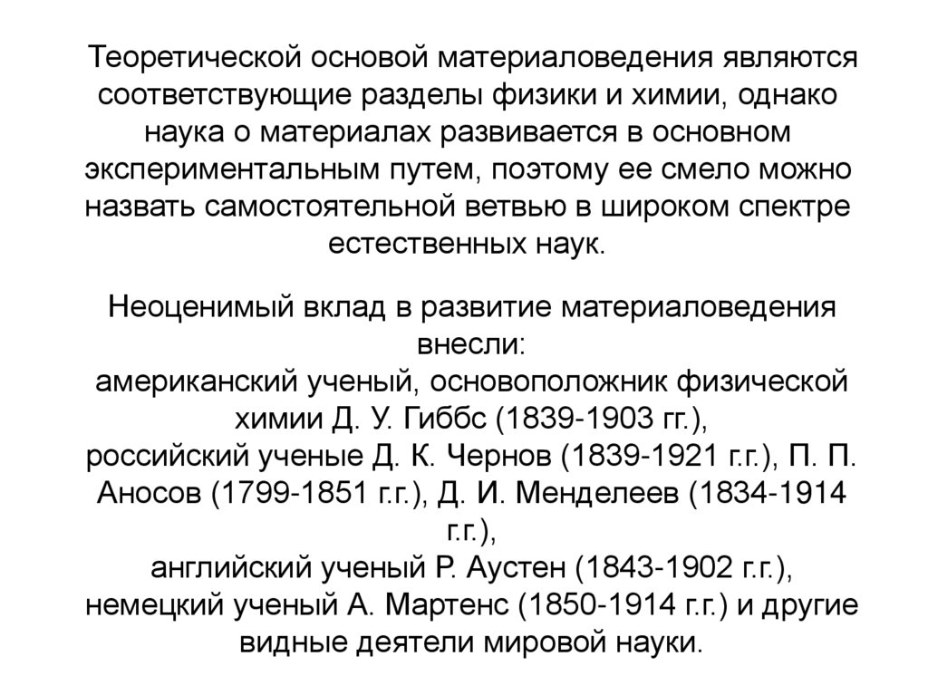Теоретической основой материаловедения являютсясоответствующие разделы физики и химии, однако