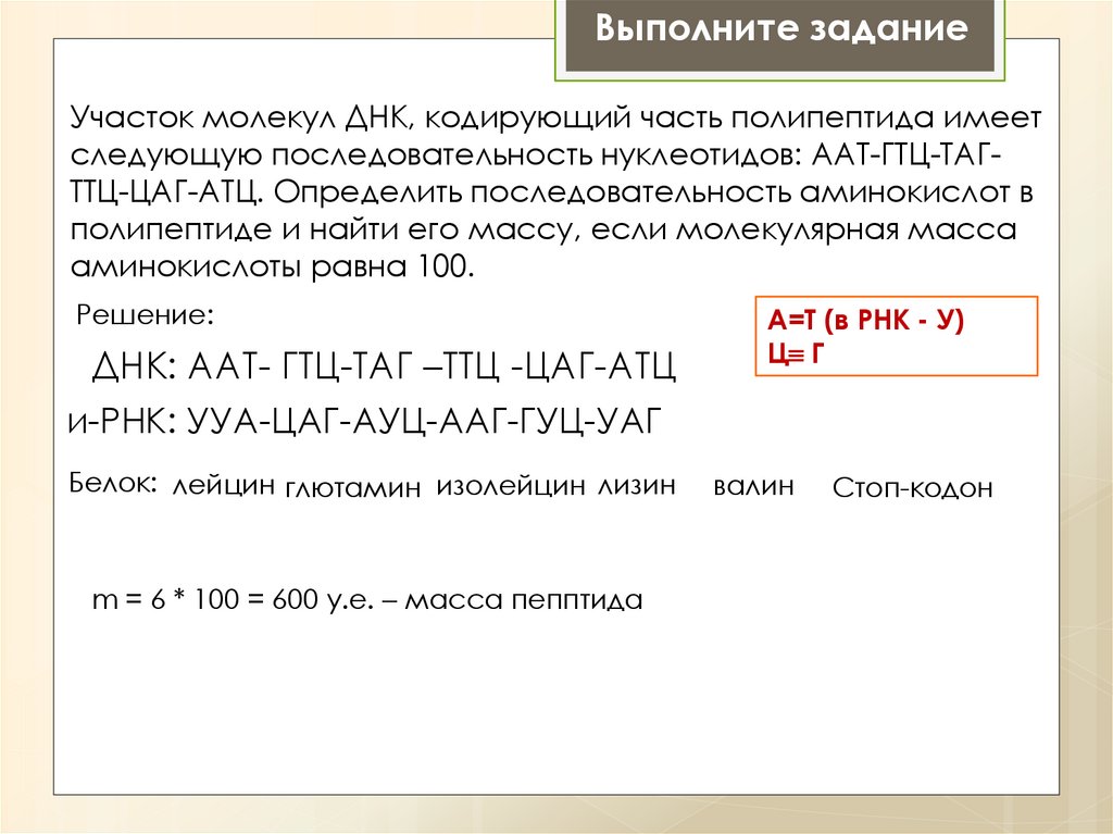 ДНК: ААТ- ГТЦ-ТАГ –ТТЦ -ЦАГ-АТЦ