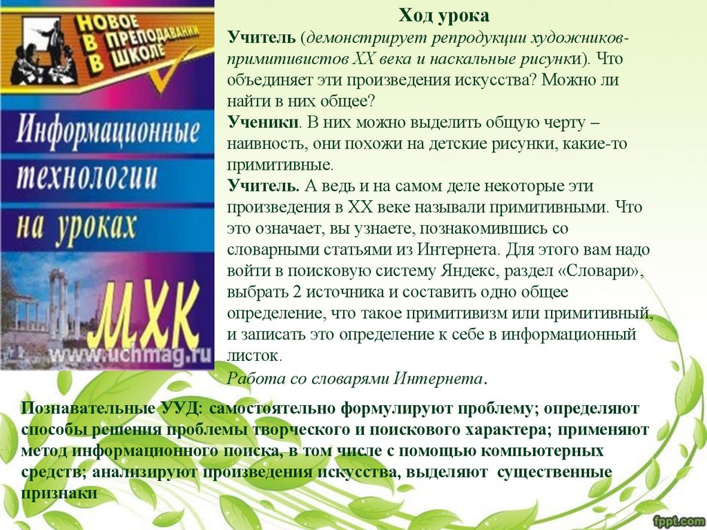 Ход урокаУчитель (демонстрирует репродукции художниковпримитивистов XX века и наскальные рисунки). Что