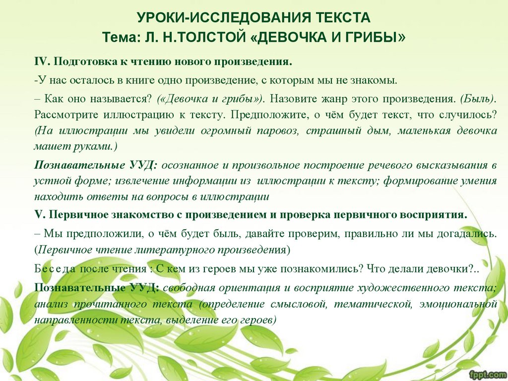 УРОКИ-ИССЛЕДОВАНИЯ ТЕКСТАТема: Л. Н.ТОЛСТОЙ «ДЕВОЧКА И ГРИБЫ»