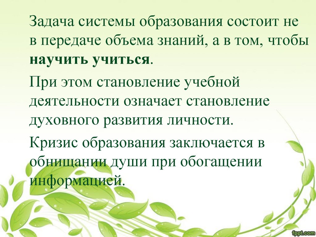 Задача системы образования состоит нев передаче объема знаний, а в том, чтобы