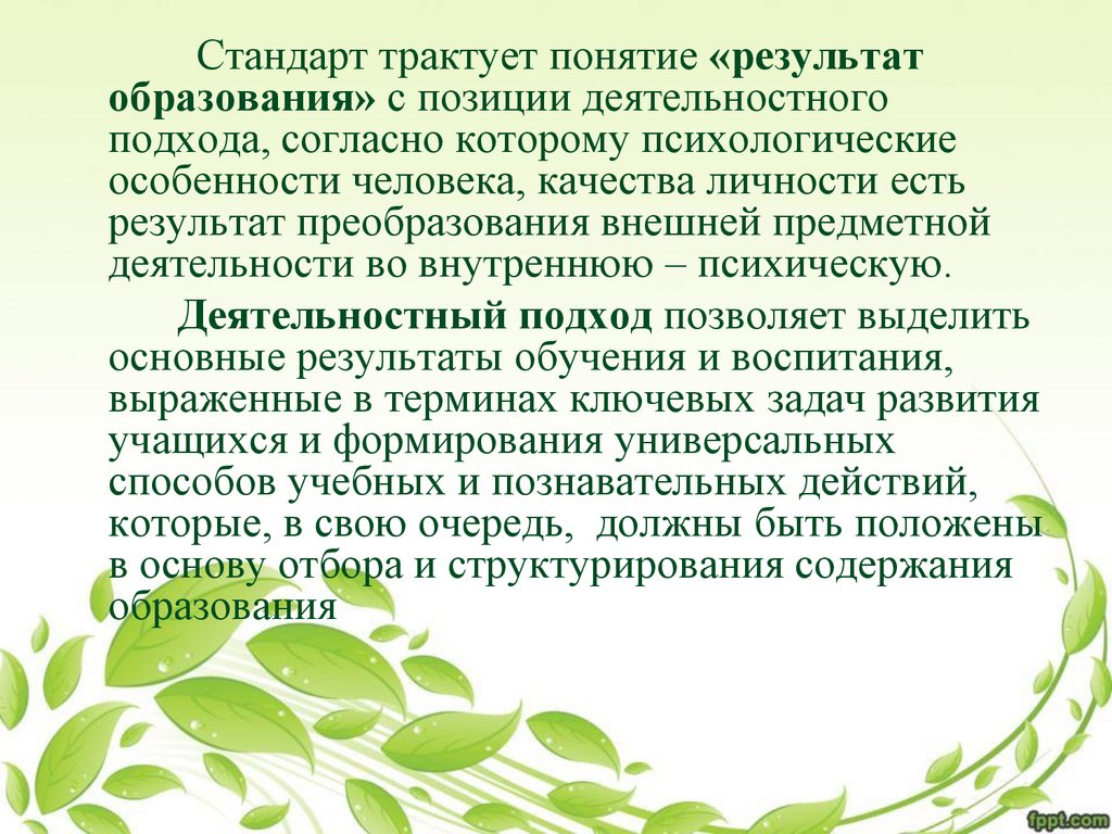 Стандарт трактует понятие «результатобразования» с позиции деятельностного