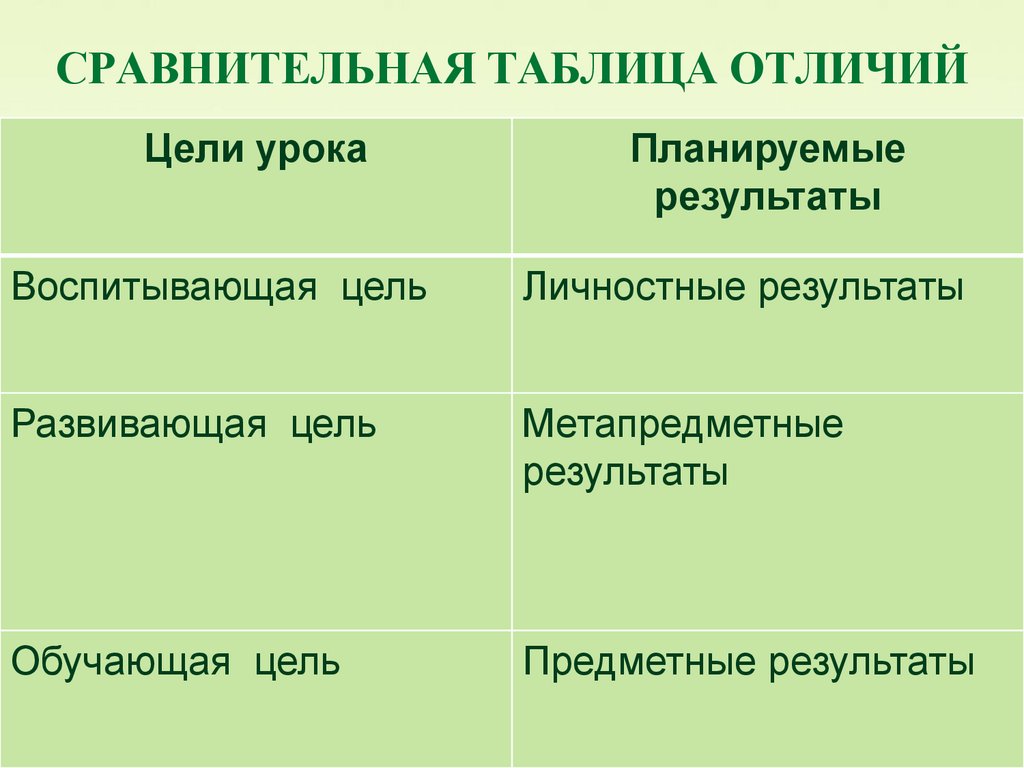 СРАВНИТЕЛЬНАЯ ТАБЛИЦА ОТЛИЧИЙЦели урока