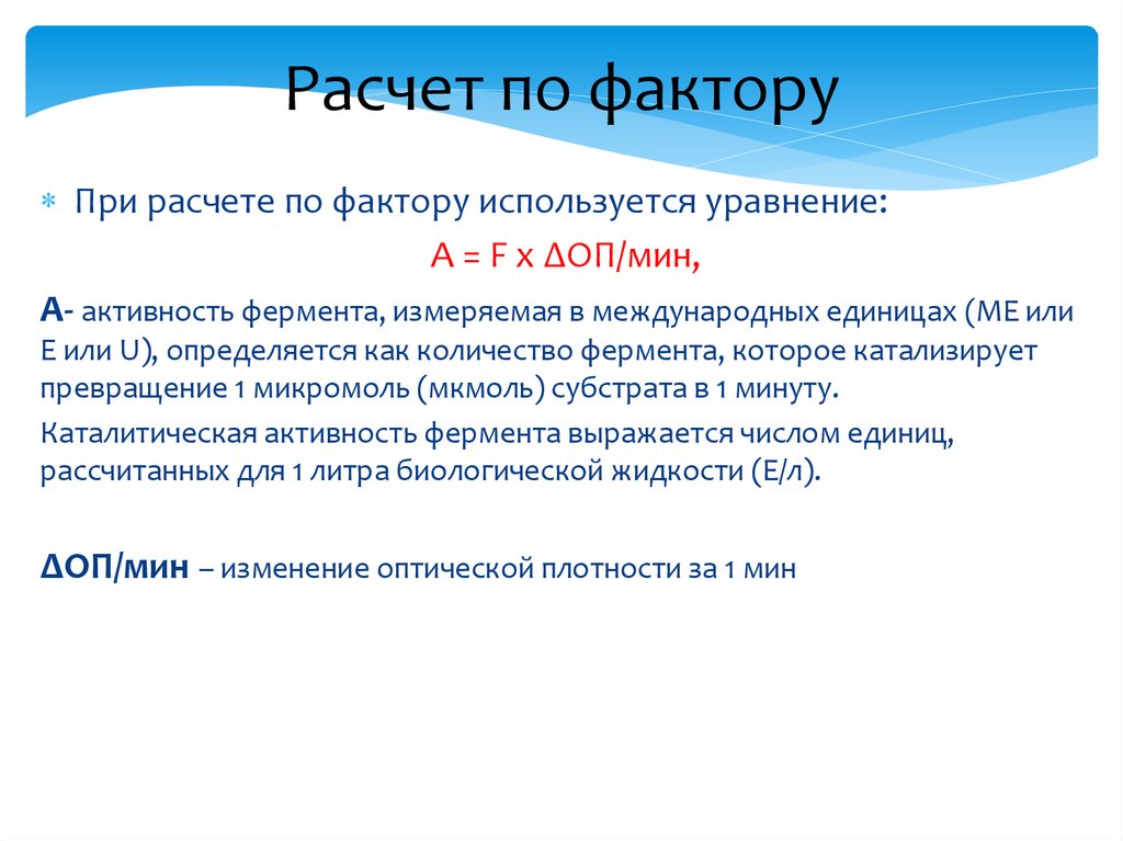 А- активность фермента, измеряемая в международных единицах (МЕ или