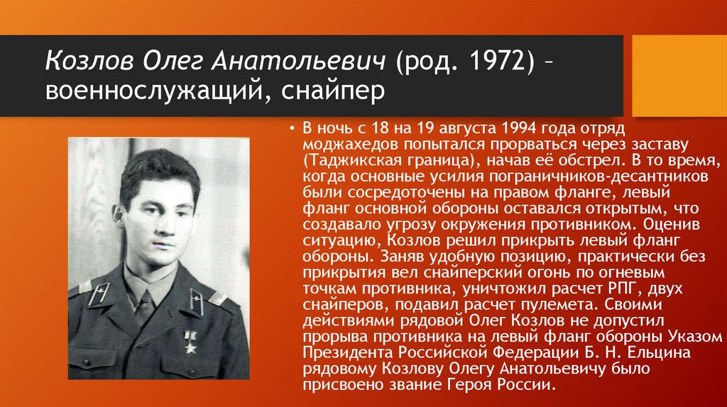 Козлов Олег Анатольевич (род. 1972) –военнослужащий, снайпер