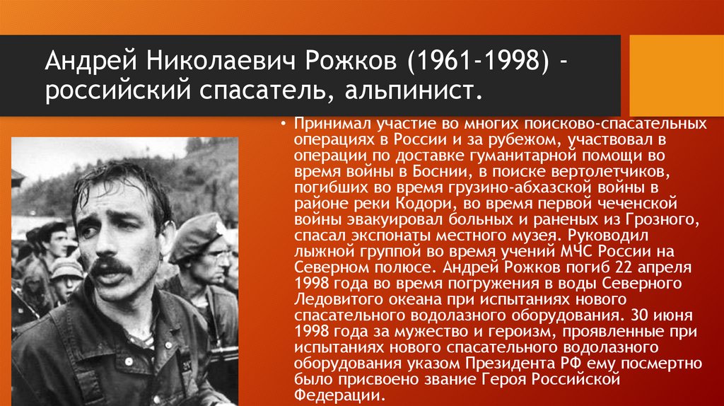 Андрей Николаевич Рожков (1961-1998) российский спасатель, альпинист.• Принимал участие во многих поисково-спасательных