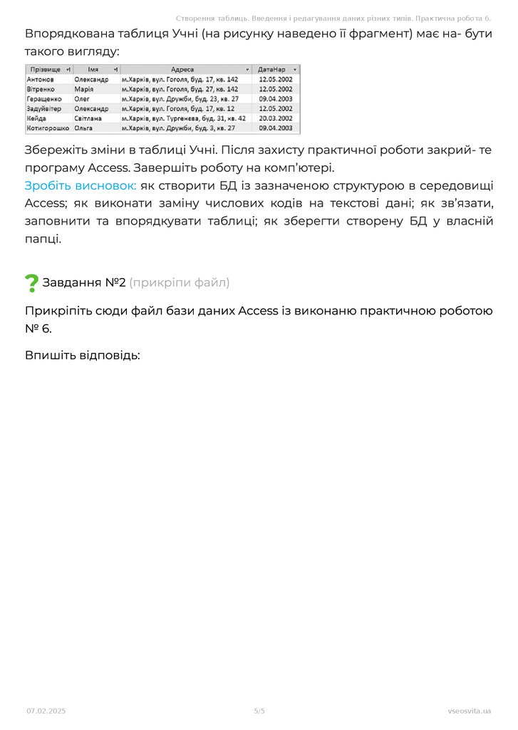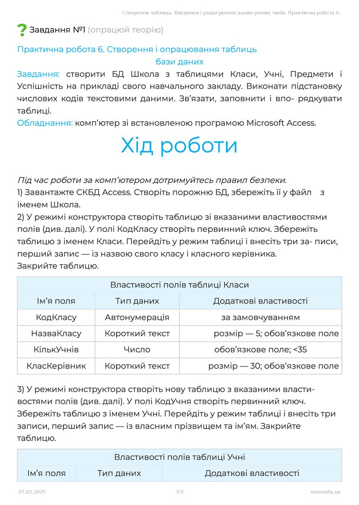 Створення таблиць. Введення і редагування даних різних типів. Практична робота 6.? Завдання №1 (опрацюй теорію)