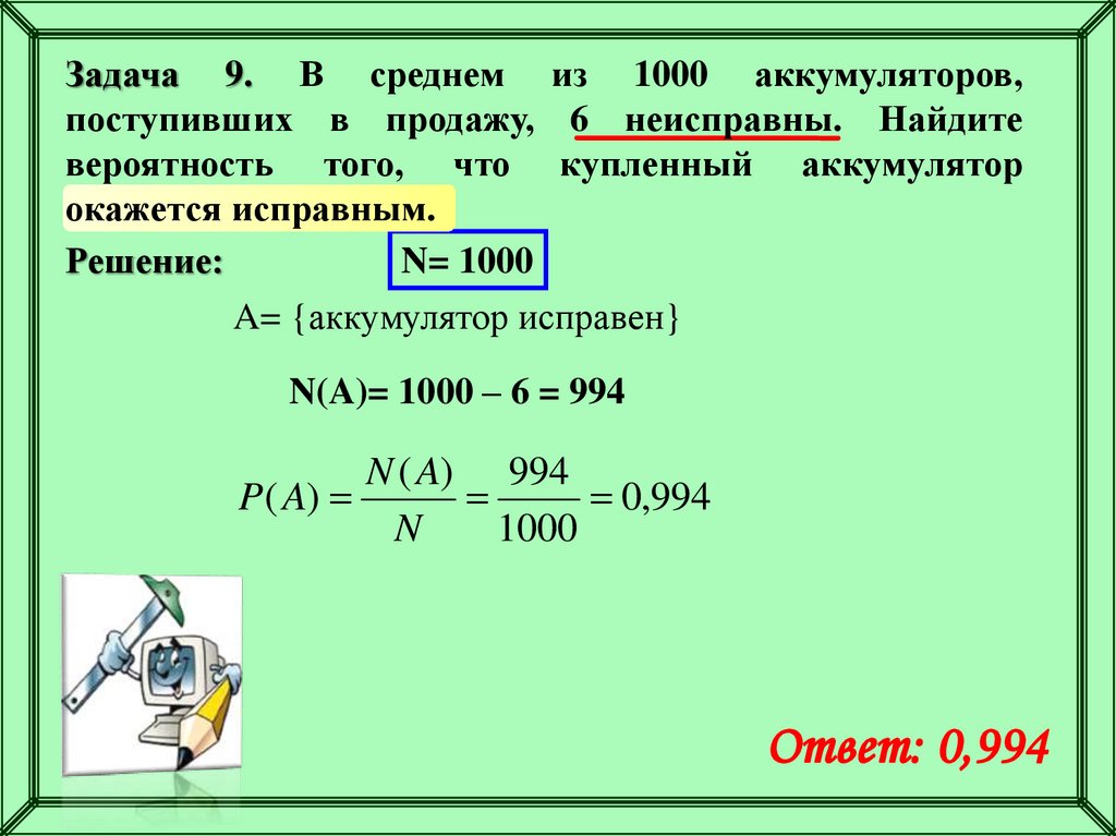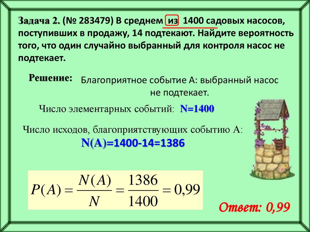 Задача 2. (№ 283479) В среднем из 1400 садовых насосов,поступивших в продажу, 14 подтекают. Найдите вероятность