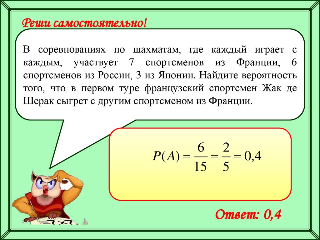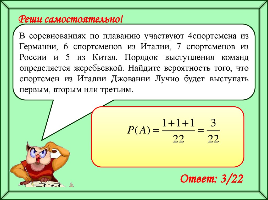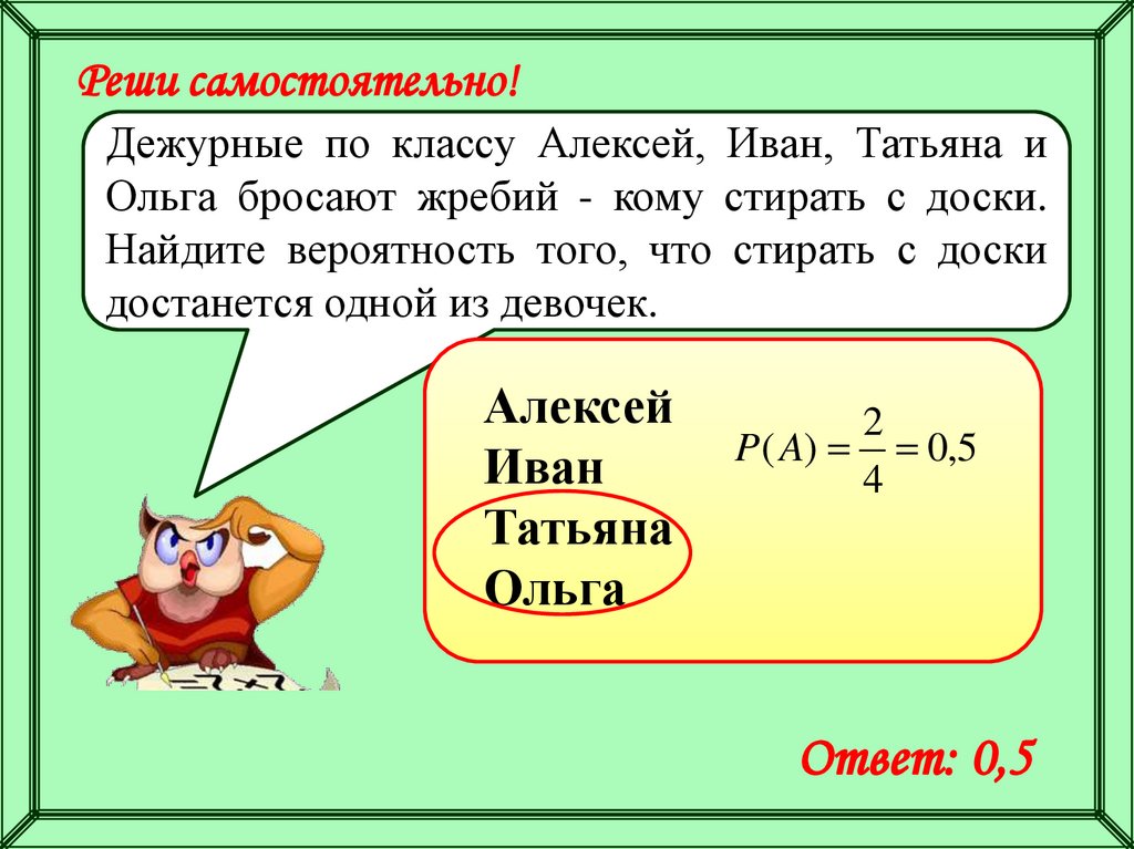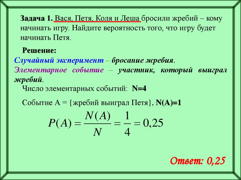 Задача 1. Вася, Петя, Коля и Леша бросили жребий – комуначинать игру. Найдите вероятность того, что игру будет