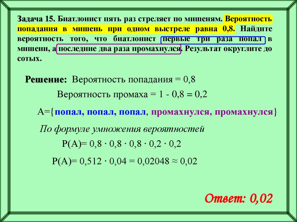Задача 15. Биатлонист пять раз стреляет по мишеням. Вероятностьпопадания в мишень при одном выстреле равна 0,8. Найдите