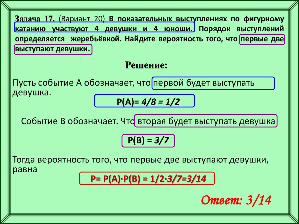 Р= Р(А)∙Р(В) = 1/2∙3/7=3/14
