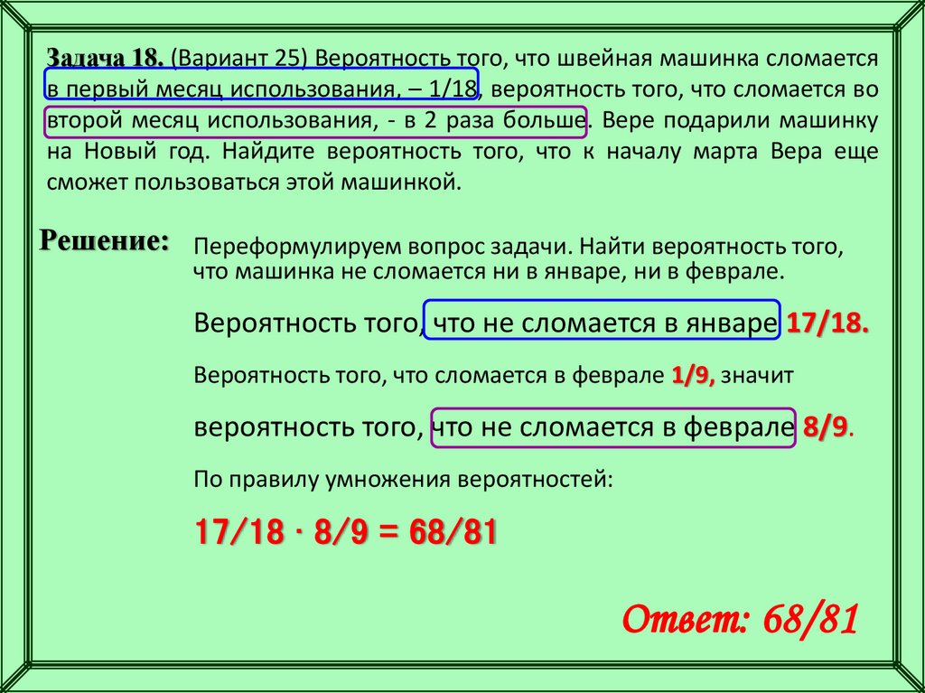 Задача 18. (Вариант 25) Вероятность того, что швейная машинка сломаетсяв первый месяц использования, – 1/18, вероятность того, что сломается во