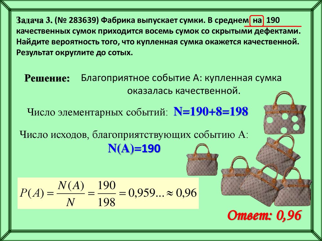 Задача 3. (№ 283639) Фабрика выпускает сумки. В среднем на 190качественных сумок приходится восемь сумок со скрытыми дефектами.