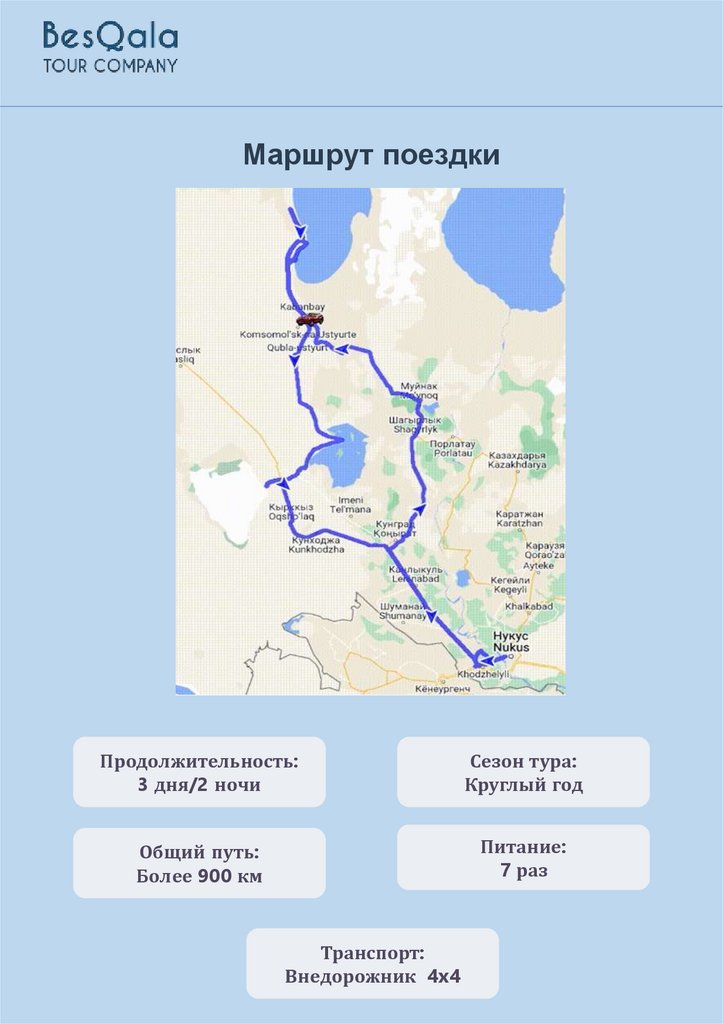 18:30 Прибытие в город Нукус,. Завершение тура.