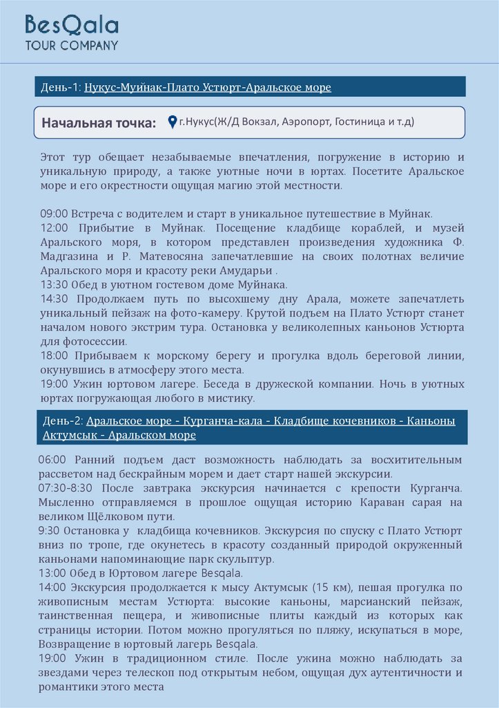 День-1: Нукус-Муйнак-Плато Устюрт-Аральское мореНачальная точка: