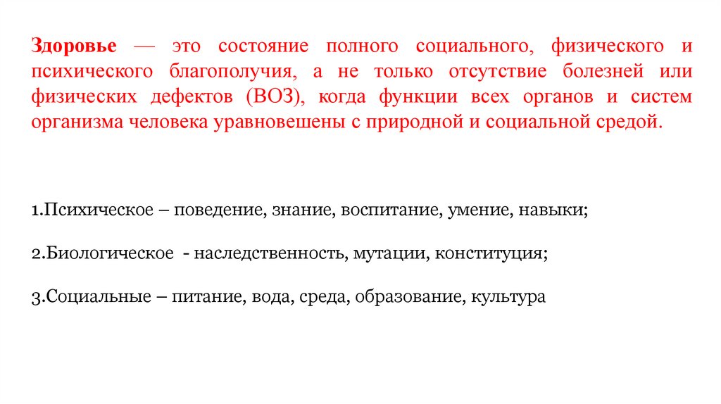 Здоровье — это состояние полного социального, физического ипсихического благополучия, а не только отсутствие болезней или