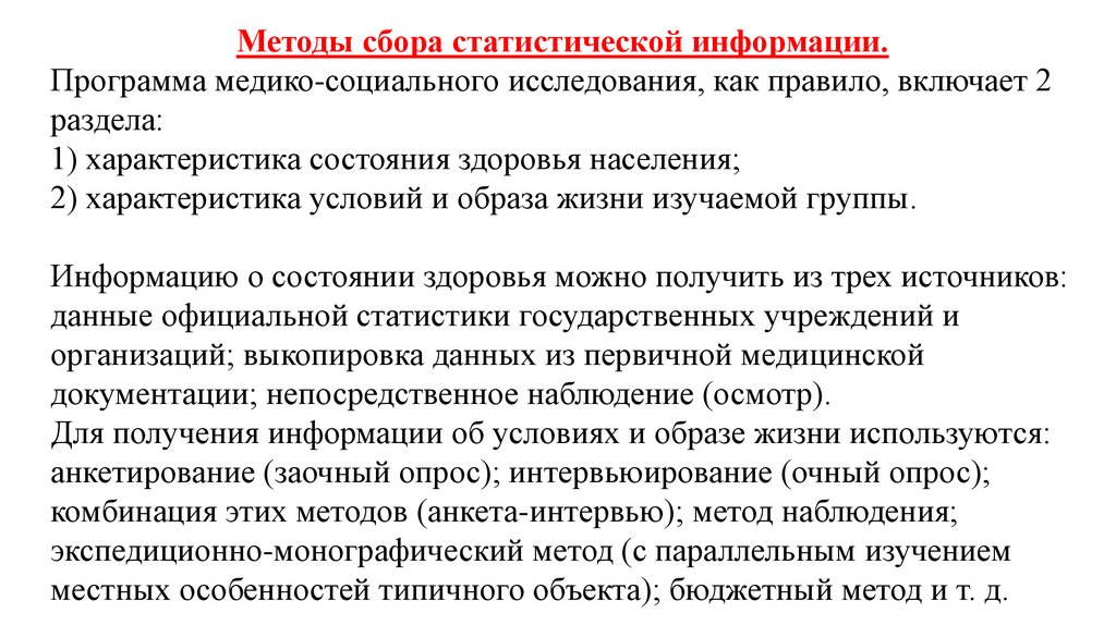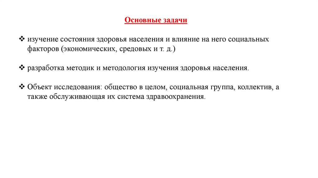 Основные задачиизучение состояния здоровья населения и влияние на него социальных