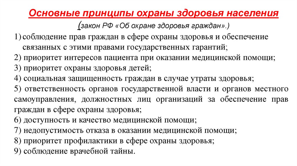 Основные принципы охраны здоровья населения(закон РФ «Об охране здоровья граждан».)